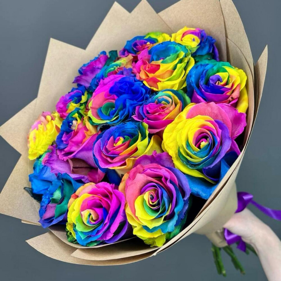 На фото букет из 17 радужных роз. В составе: роза 17 шт, крафт-бумага 2 шт, атласная лента 1 шт, . Все цветы свежие и ароматные, букет красиво оформлен и отлично подходит для подарка. Доступна доставка цветов или самовывоз.