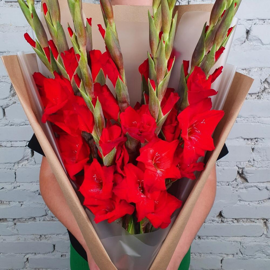 На фото букет 9 красных гладиолусов. В составе: гладиолус 9 шт, крафт-бумага 2 шт, атласная лента 1 шт, . Все цветы свежие и ароматные, букет красиво оформлен и отлично подходит для подарка. Доступна доставка цветов или самовывоз.