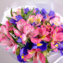 На фото букет из синих ирисов из розовых альстромерий. В составе: ирис 11 шт, альстромерия 4 шт, атласная лента 1 шт, дизайнерская упаковка 1 шт, . Все цветы свежие и ароматные, букет красиво оформлен и отлично подходит для подарка. Доступна доставка цветов или самовывоз.