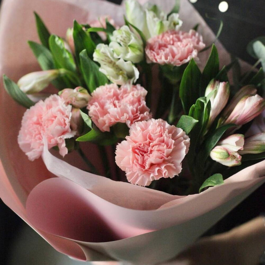 На фото букет «пудровая вуаль». В составе: альстромерия 3 шт, гвоздика 5 шт, эвкалипт 2 шт, дизайнерская упаковка 1 шт, атласная лента 1 шт, . Все цветы свежие и ароматные, букет красиво оформлен и отлично подходит для подарка. Доступна доставка цветов или самовывоз.